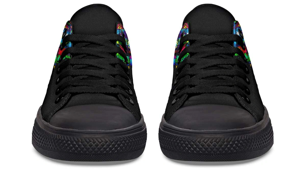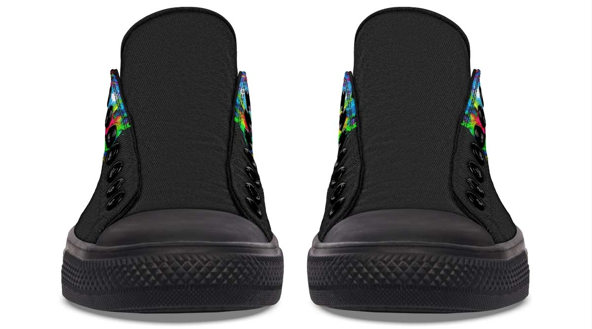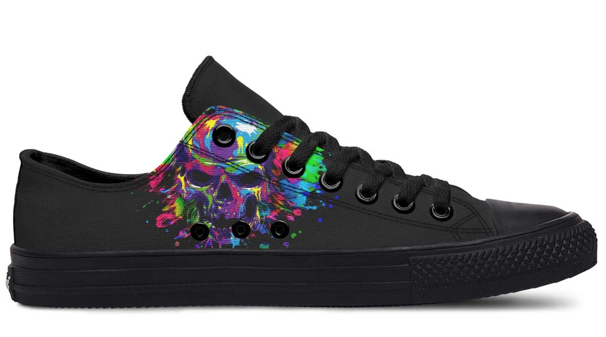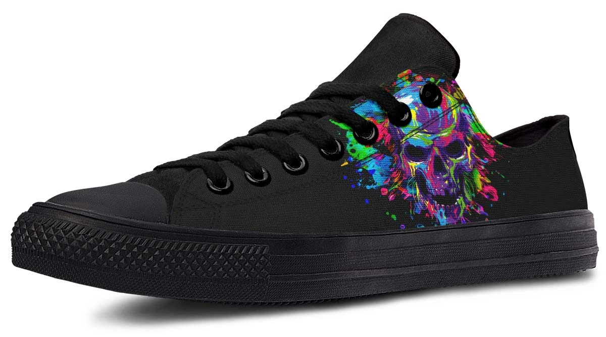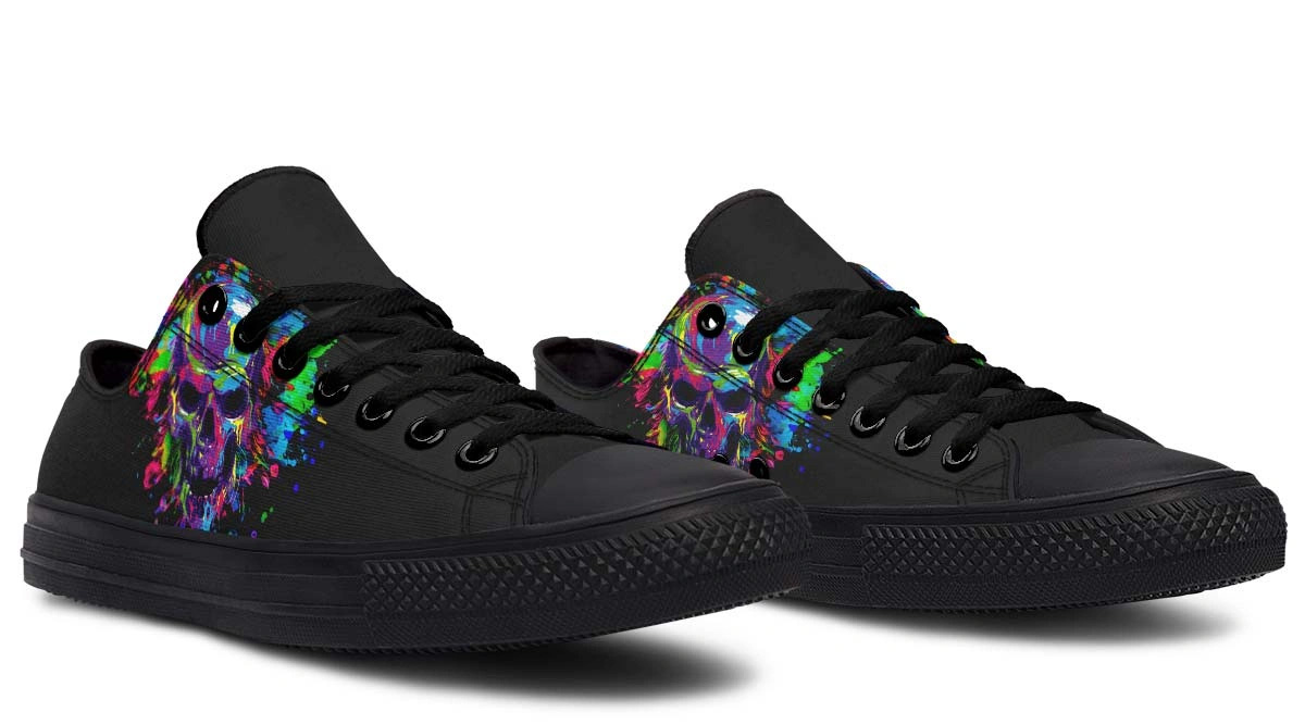 Elevate your footwear with Painted Skull Black Lowtop Sneakers. Merging artistic skull motifs with a sleek black canvas for a bold, versatile look.