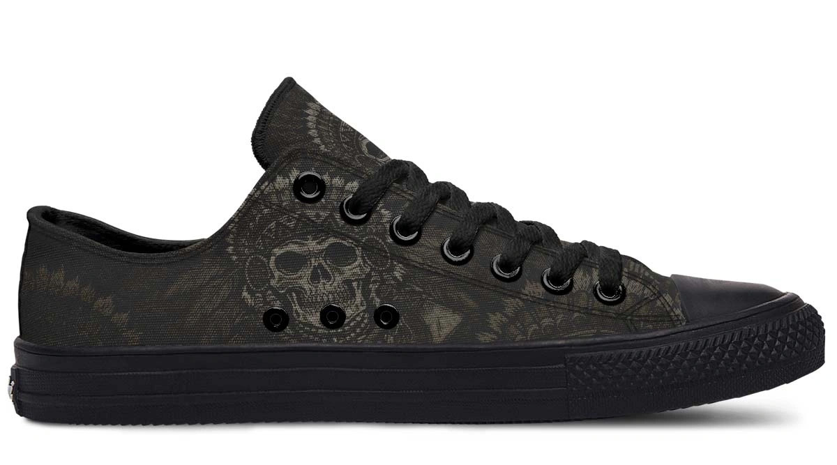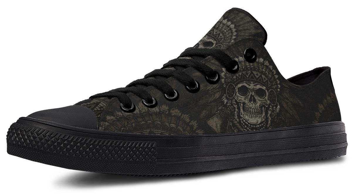 Elevate your street style with these Native American skull art low top sneakers. Combining traditional cultural motifs with a modern edgy aesthetic, these sneakers feature a bold skull design that stands out from the crowd. Built for both comfort and durability, they offer a snug fit and breathable feel for long hours of wear. Perfect for fashion-forward individuals looking to add a unique flair to their footwear collection. Keywords: tribal skull shoes, urban art sneakers, native inspired footwear, stylish low tops.